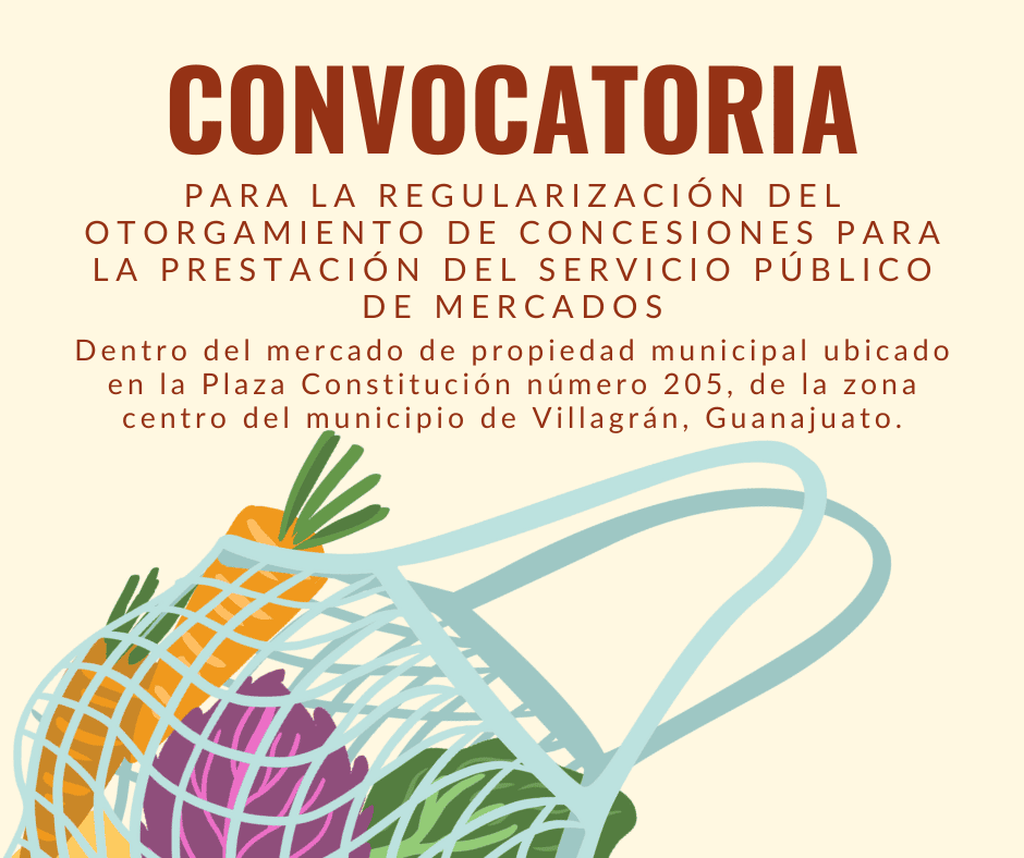 El H. Ayuntamiento de Villagrán, Guanajuato invita a las personas locatarias, comerciantes y ciudadanía interesada a participar en el proceso de regularización de la explotación de los locales comerciales del Mercado Municipal, mediante el otorgamiento de concesiones administrativas, conforme a la normatividad vigente.